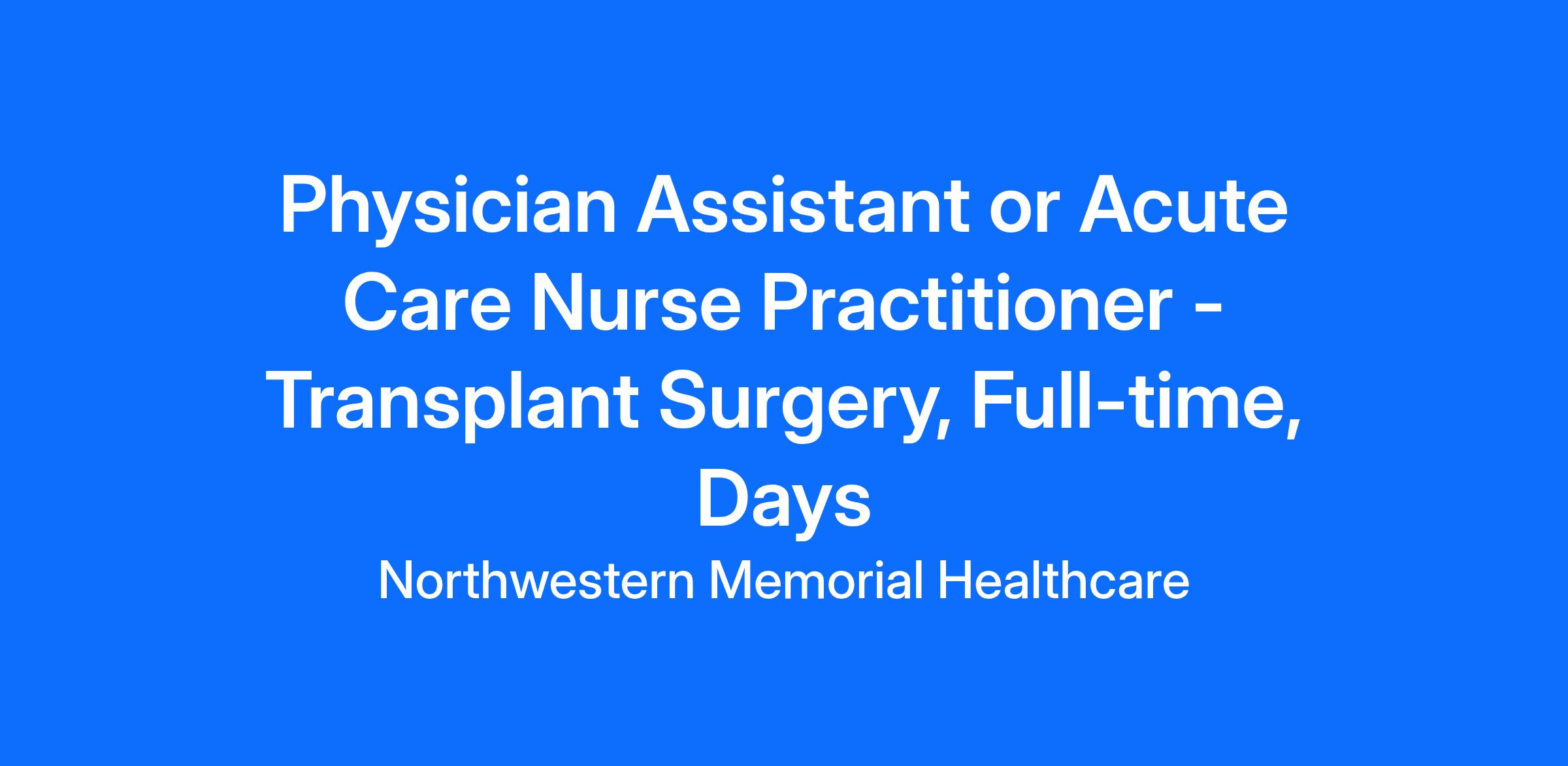Northwestern Medicine has an exciting opportunity for either an acute Nurse Practitioner or a Physician Assistant to work in our Transplant Surgery department. The APP provides care for Abdominal transplant surgery, manages the care for liver, kidney and pancreas transplant recipients.