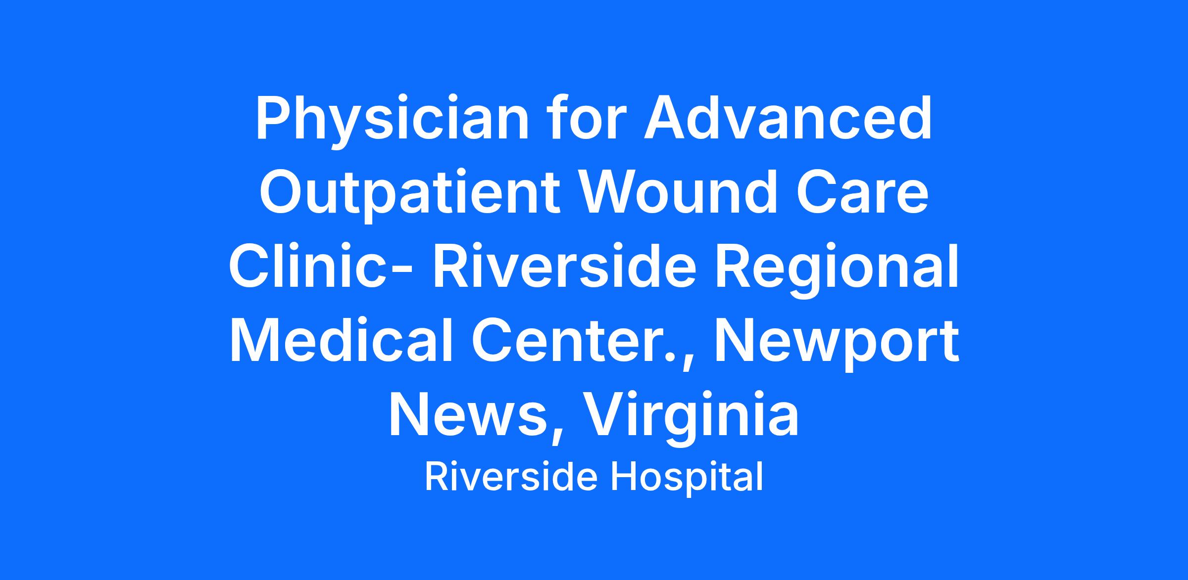 Riverside Medical Group is seeking a full-time, board-certified Physician to join our Advanced Outpatient Wound Care Clinic team at Riverside Regional Medical Center.