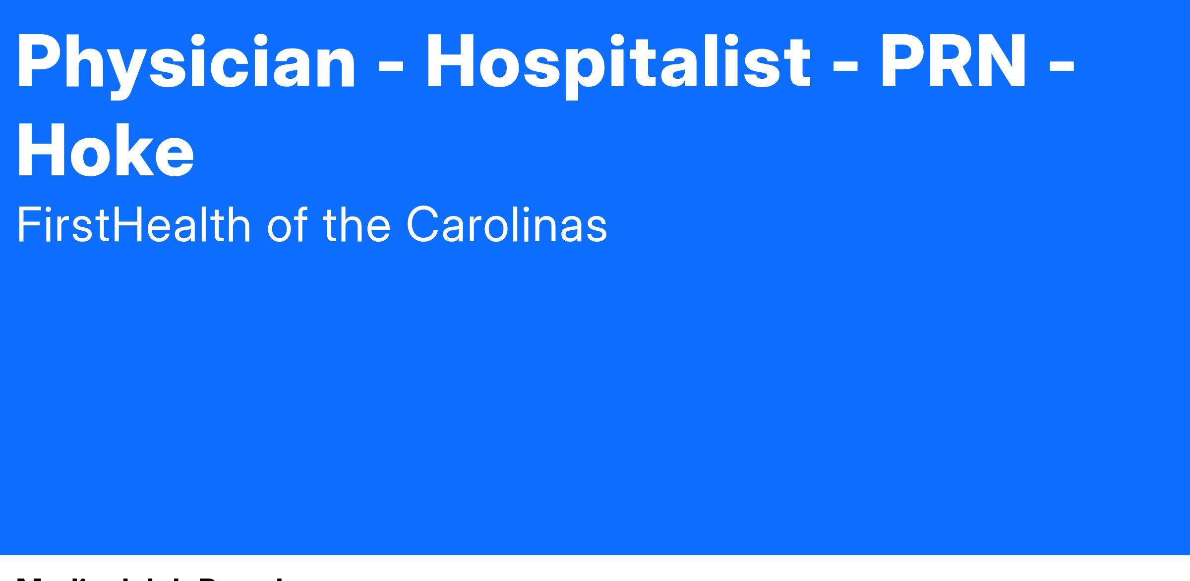 FirstHealth of the Carolinas is a private, community-based health care network serving the mid-Carolinas, nationally recognized as a top 150 place to work in health care by Becker’s Healthcare - is seeking experienced Hospitalists to practice at our newest campus in Raeford, NC on PRN basis.