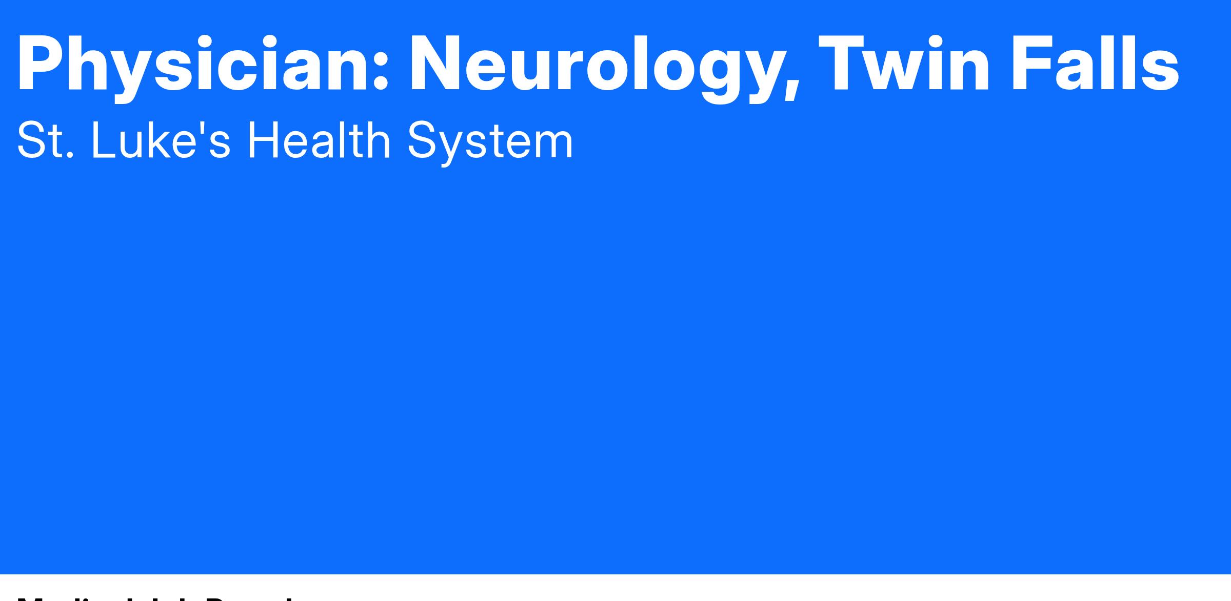 St. Luke's Health System is seeking a BC/ Neurologist to join our busy, well-established, busy practice in Twin Falls, Idaho. The ideal candidate will have an interest and expertise in the broad management of general neurology disorders. St. Luke’s specialists emphasize coordinated, collaborative care to ensure patients receive system based multi-disciplinary care.