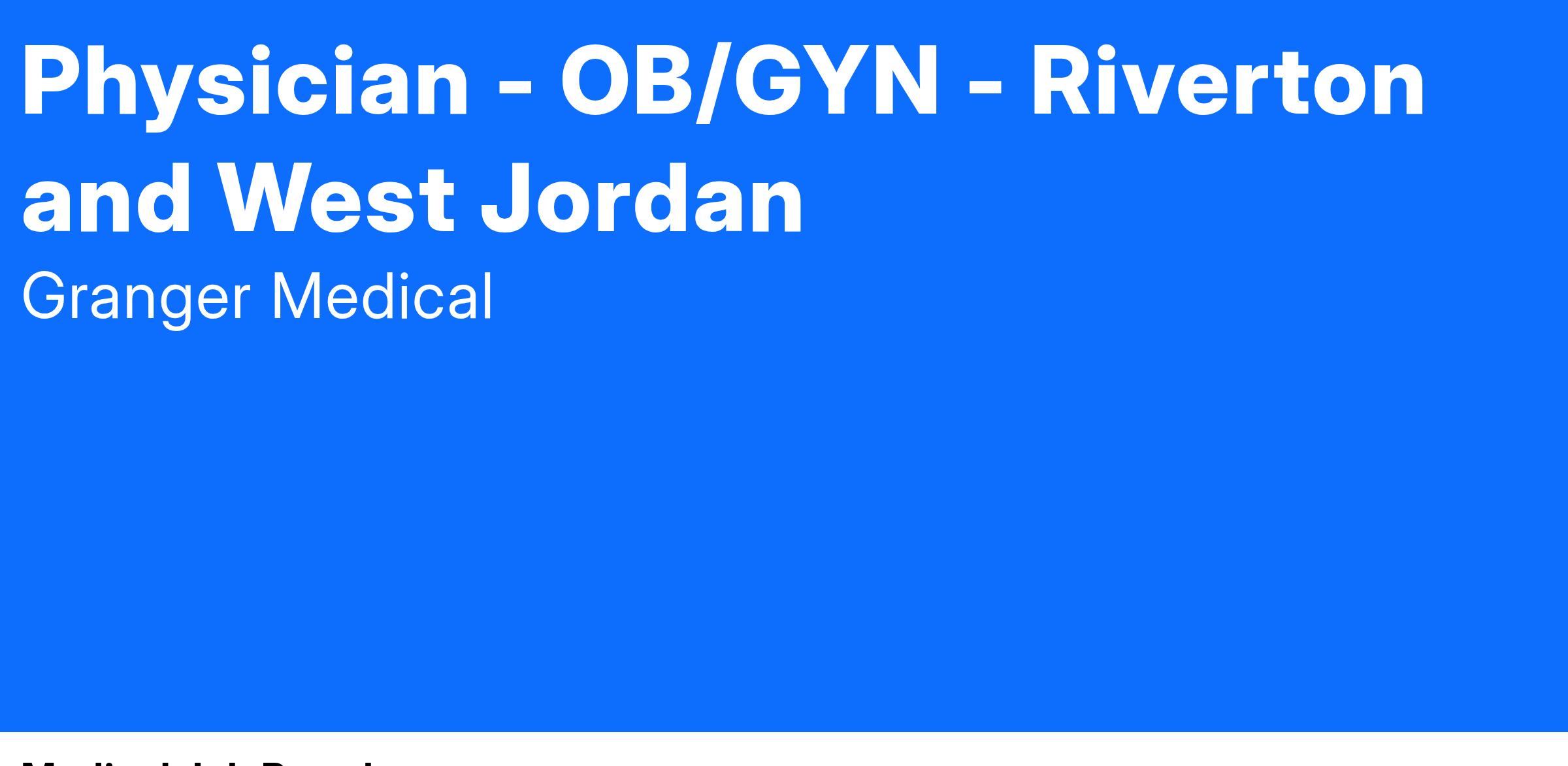 Actively seeking a Board Certified/Board Eligible OBGYN Physician to join an existing OBGYN department, as part of Granger's multi-specialty medical clinics in Riverton and West Jordan.