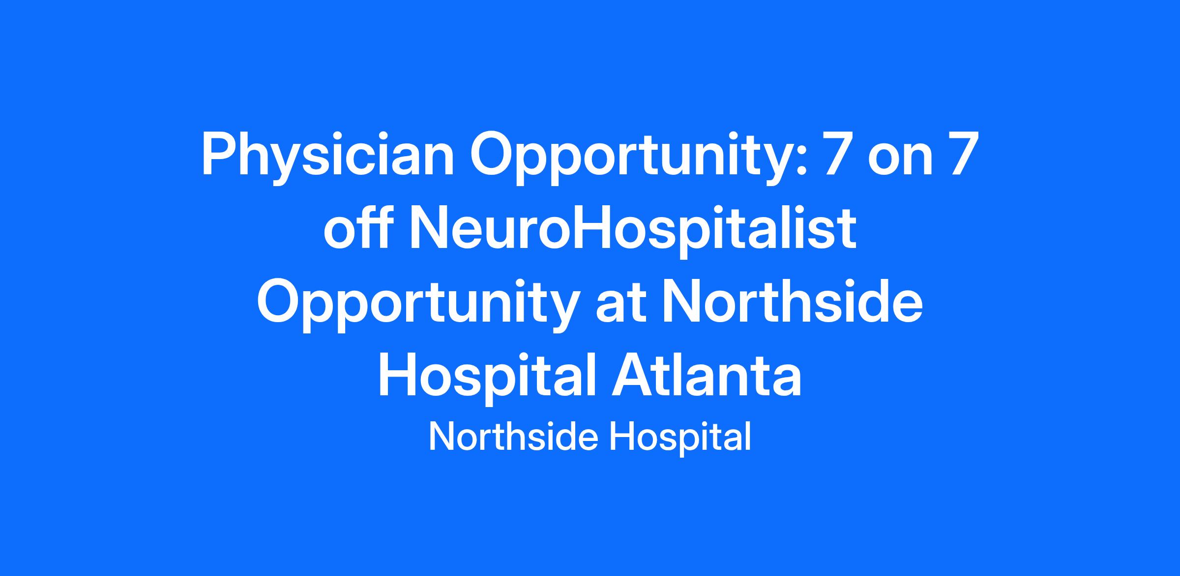 Northside Hospital is seeking a Neurohospitalist for our Metro Atlanta, GA campus. This is not just a job, but an opportunity to join a fast-growing, dynamic group that shares a team approach and a pleasant and collegial atmosphere. It's a chance to further your professional growth and make a significant impact in the field of Neurology.