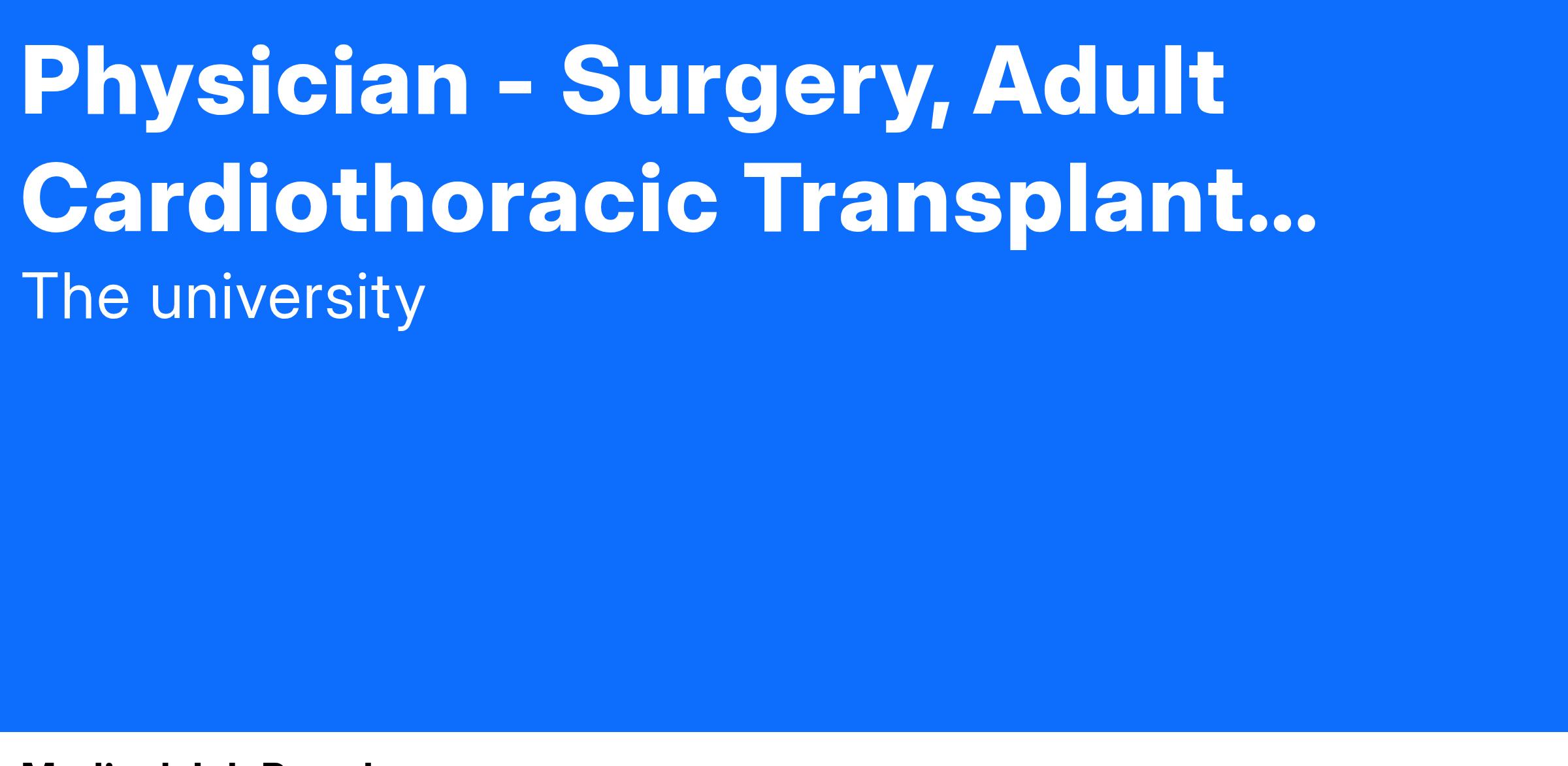 The Ohio State University College of Medicine and the Wexner Medical Center seek a cardiac surgery faculty member at the Assistant or Associate Professor level with a cardiothoracic transplant focus to join the Department of Surgery.