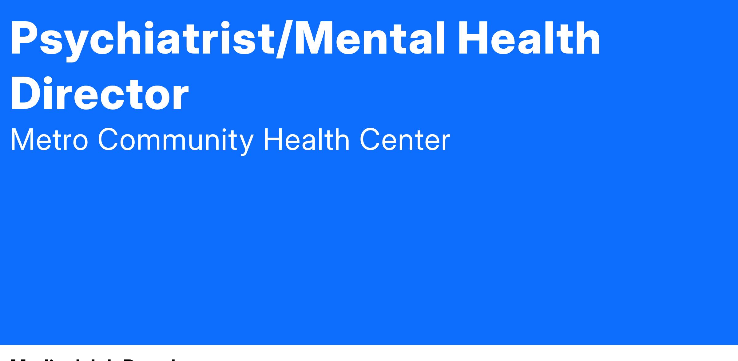 Job Summary: This position will facilitate the mission of Metro Family Practice to ensure the delivery of quality patient care and coordination of direct patient within the health center. The individual will administer to the needs of the patients by following the scope of practice and standards of care accurately. The psychiatrist will provide the highest level of care to ensure the quality, cost effective programs and services in all stages of the lifecycle, including other duties, tasks or projects, as needed.
