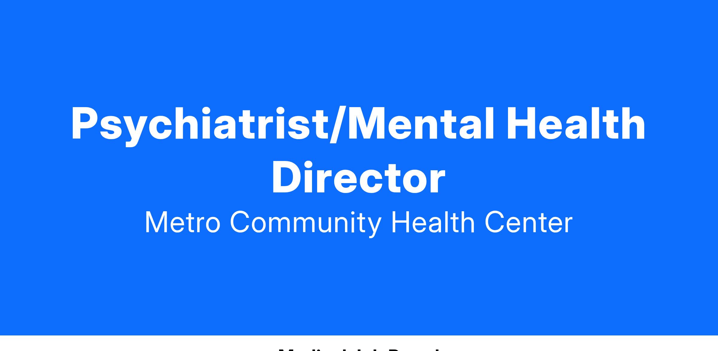 Job Summary: This position will facilitate the mission of Metro Family Practice to ensure the delivery of quality patient care and coordination of direct patient within the health center. The individual will administer to the needs of the patients by following the scope of practice and standards of care accurately. The psychiatrist will provide the highest level of care to ensure the quality, cost effective programs and services in all stages of the lifecycle, including other duties, tasks or projects, as needed.