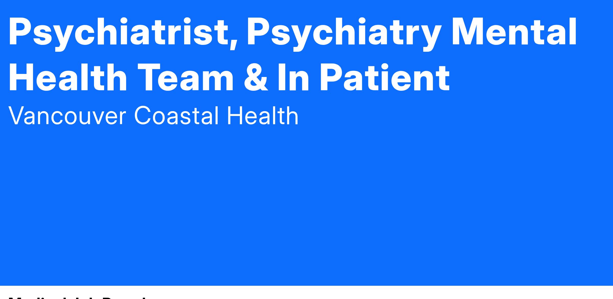 Come work as Psychiatrist with Vancouver Coastal Health (VCH)!