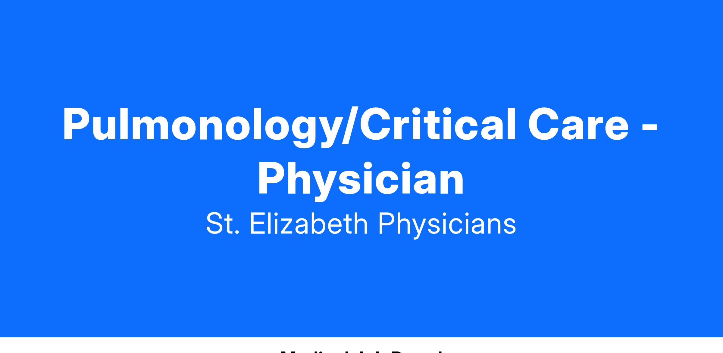 Board Certified/Board Eligible Pulmonary/Critical Care physician wanted to join our growing, well-respected group, with the full support of our award-winning hospital system, St. Elizabeth Healthcare, in Lawrenceburg, Indiana. Join the St. Elizabeth team and enjoy a competitive compensation and benefits package, a great place to live and work and a very substantial referral base. Relocation assistance is also available.
