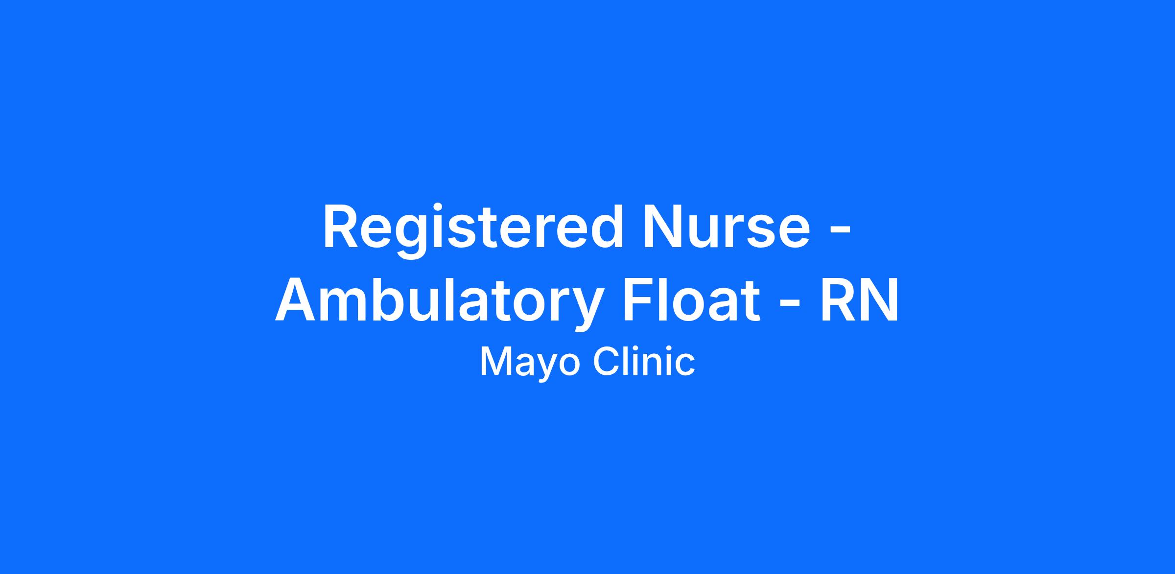 The Ambulatory Float Registered Nurse (RN) works in variety of dynamic specialty clinics including, but not limited to, the following locations: Charlton, Gonda, Mayo Clinic, NE Clinic, and the Support Center at Superior Drive. Ambulatory floats provide both direct and non-direct patient care to support the unique needs of the clinical practice. Responsibilities may include patient education visits, patient care visits, providing immunizations, lab monitoring, prescription refills per protocol, performing limited procedures, point of care testing, and telephone based symptom assessment, triage, care by protocol among other skills. The Ambulatory Float Pool supports 35 different RN practices serving patients from pediatrics through adulthood across a multitude of specialties. An individual RN within the Ambulatory Float Pool will train and work in six to ten different practices or specialties based on FTE and practice mix. Hours are Monday through Friday, with varied start times from 6 am to 8 am. The majority of the schedule is 8-4:30 or 8-5 based on unit need.