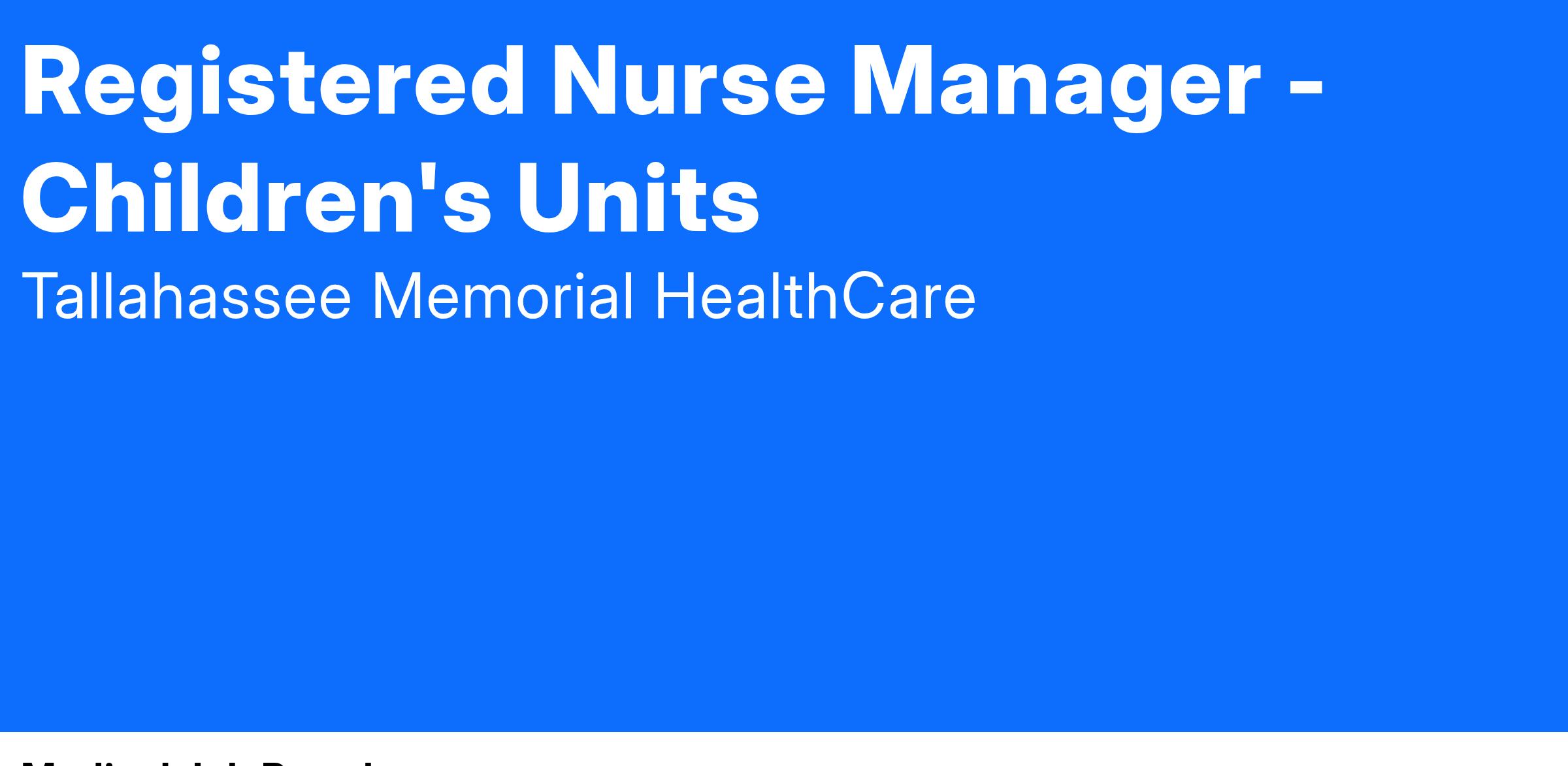 Tallahassee Memorial HealthCare is an equal opportunity employer and drug-free workplace. All employment is contingent upon successful completion of a drug screen, background check, reference verification, health assessment, and credential/license verification.
