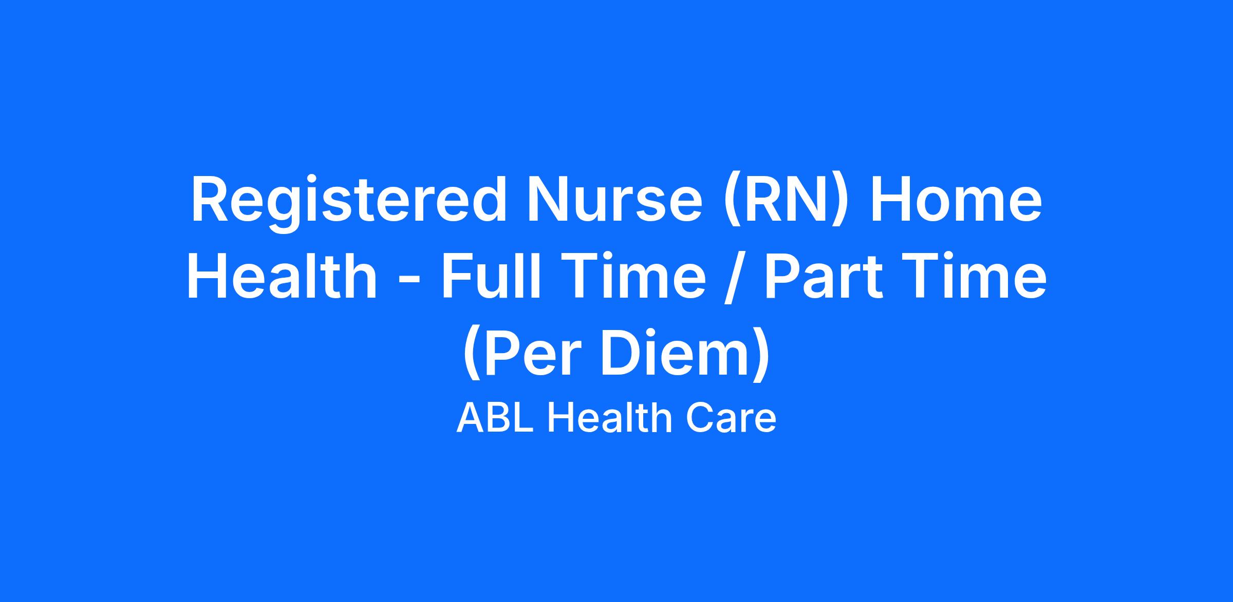 For many years, ABL Healthcare and ABL Hospice have been trusted providers of home healthcare and hospice services, dedicated to delivering compassionate, personalized care that prioritizes comfort, dignity, and support for both patients and their families - ensuring they receive appropriate care at every stage of their journey. We are currently seeking a compassionate, organized, and team-oriented individual to join our Home Health team as a Full-Time or Part-Time (Per Diem) Registered Nurse (RN) in Brentwood, CA.