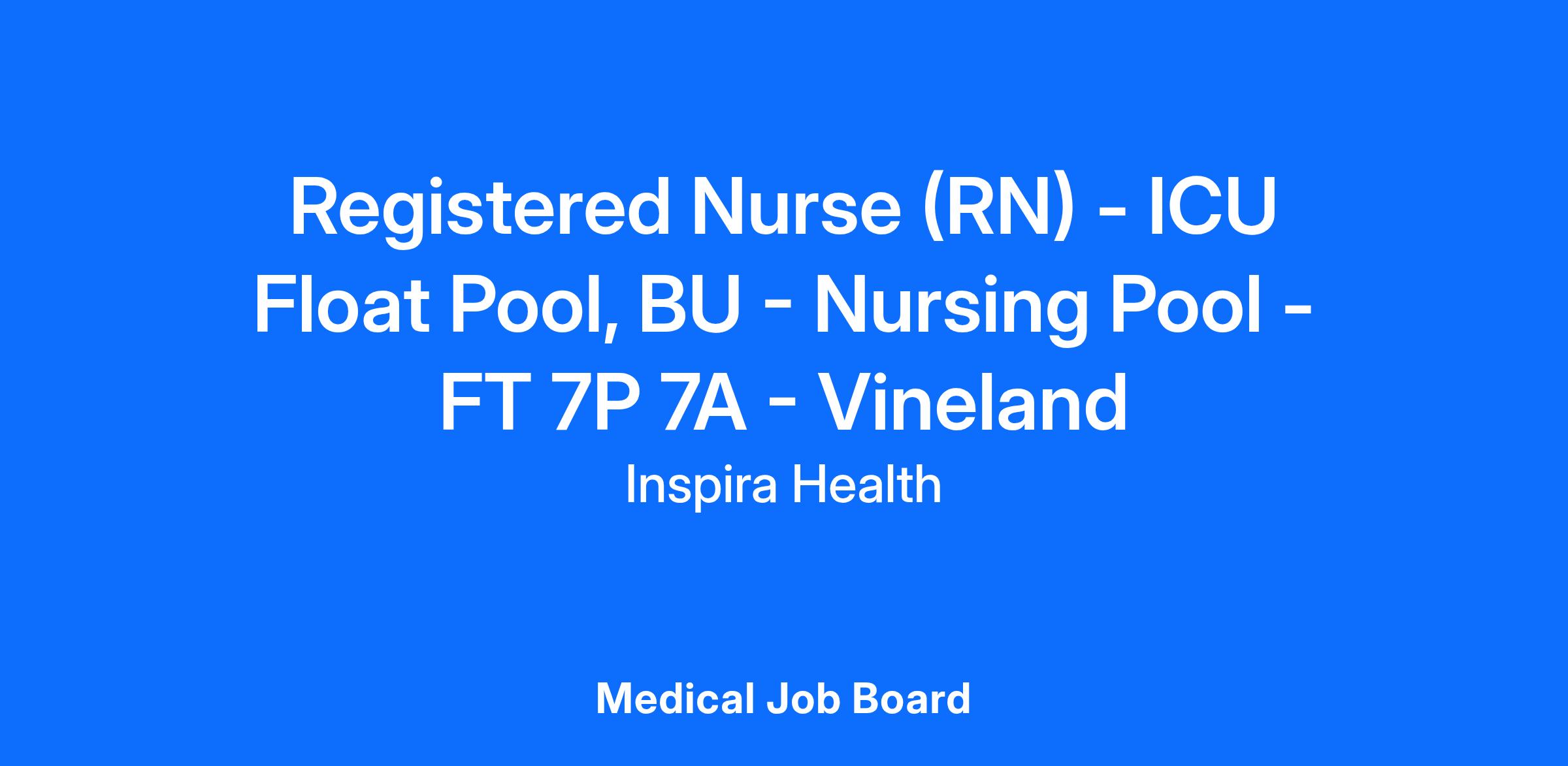 The Float Pool ICU Registered Nurse (RN) provides staffing support throughout Vineland and Elmer medical centers ICUs to adequately meet the volume and acuity of patients. Float Pool RNs perform direct patient care in a variety of ICU settings and may be reassigned to the Step-Down Units.