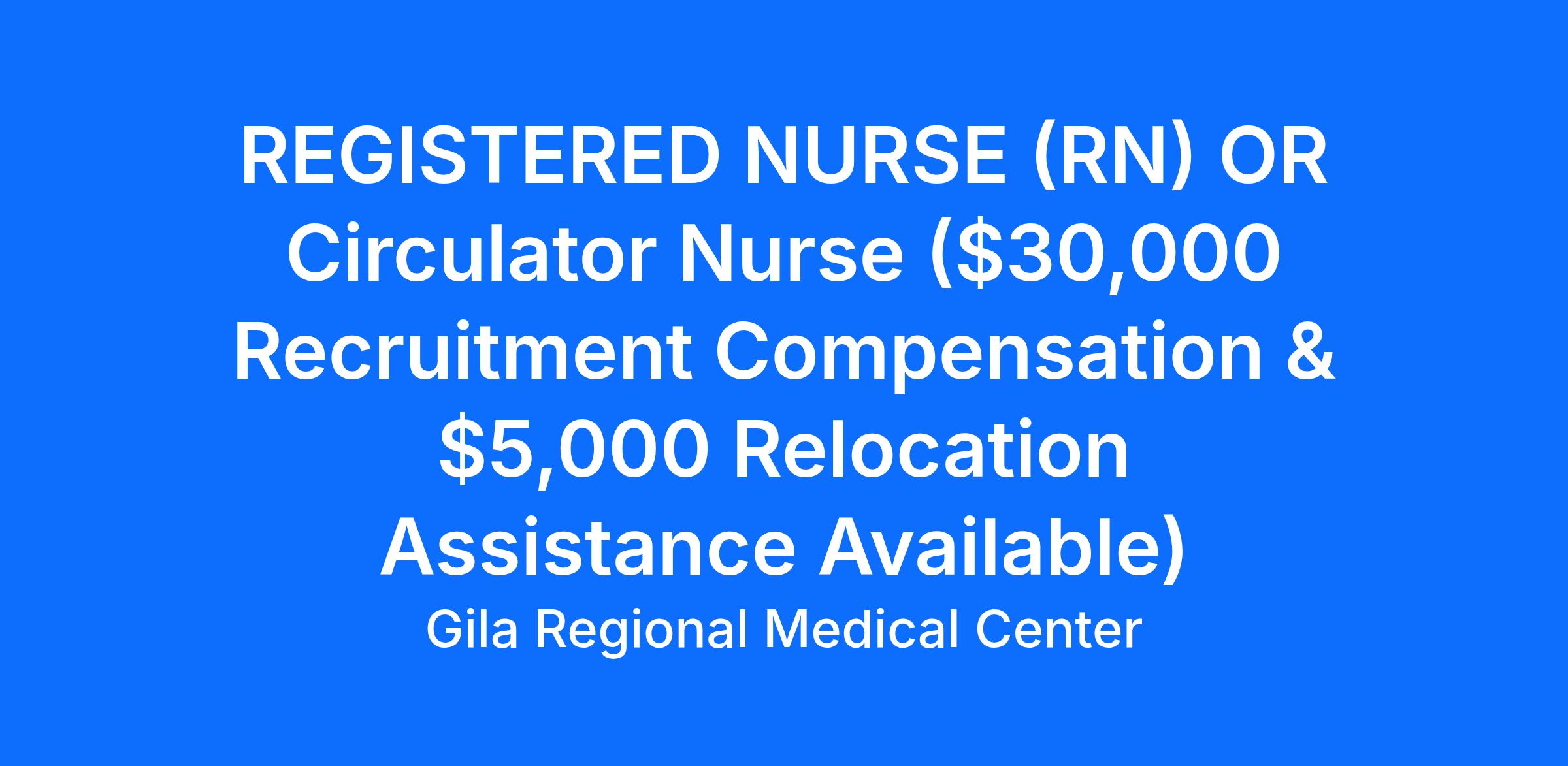 REGISTERED NURSE (RN) OR Circulator Nurse ($30,000 Recruitment Compensation & $5,000 Relocation Assistance Available)