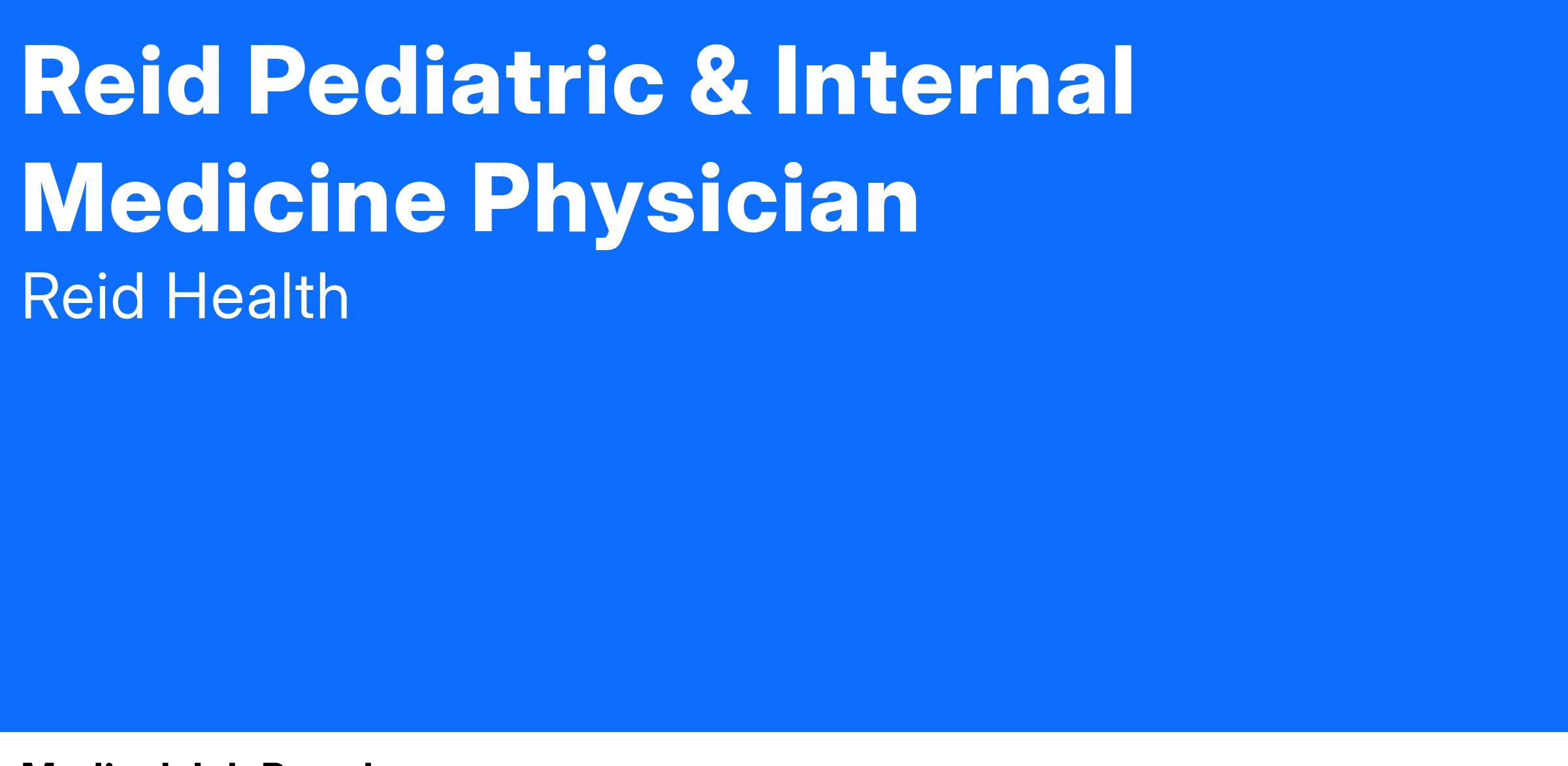 As a top-quality health system, Reid Health seeks clinicians with a focus on patient care to join its team. The ideal board-certified candidate demonstrates our values of excellence, empathy, integrity, and accountability. As part of our team, providers are encouraged to expand their role outside of medicine, to develop as managers and leaders, and to contribute in many ways to the care and well-being of the 285,000 residents we serve. We are a provider led organization providing excellent care for eight counties in Indiana and Ohio. Seeking a patient-centered and empathetic Physician to join our Reid Pediatric & Internal Medicine team consisting of 4 physicians and 2 NP's. This individual will provide and manage direct patient care, perform physical examinations and tests, obtain medical history and documentation, and instruct patients regarding diagnosis, medications, and treatment.