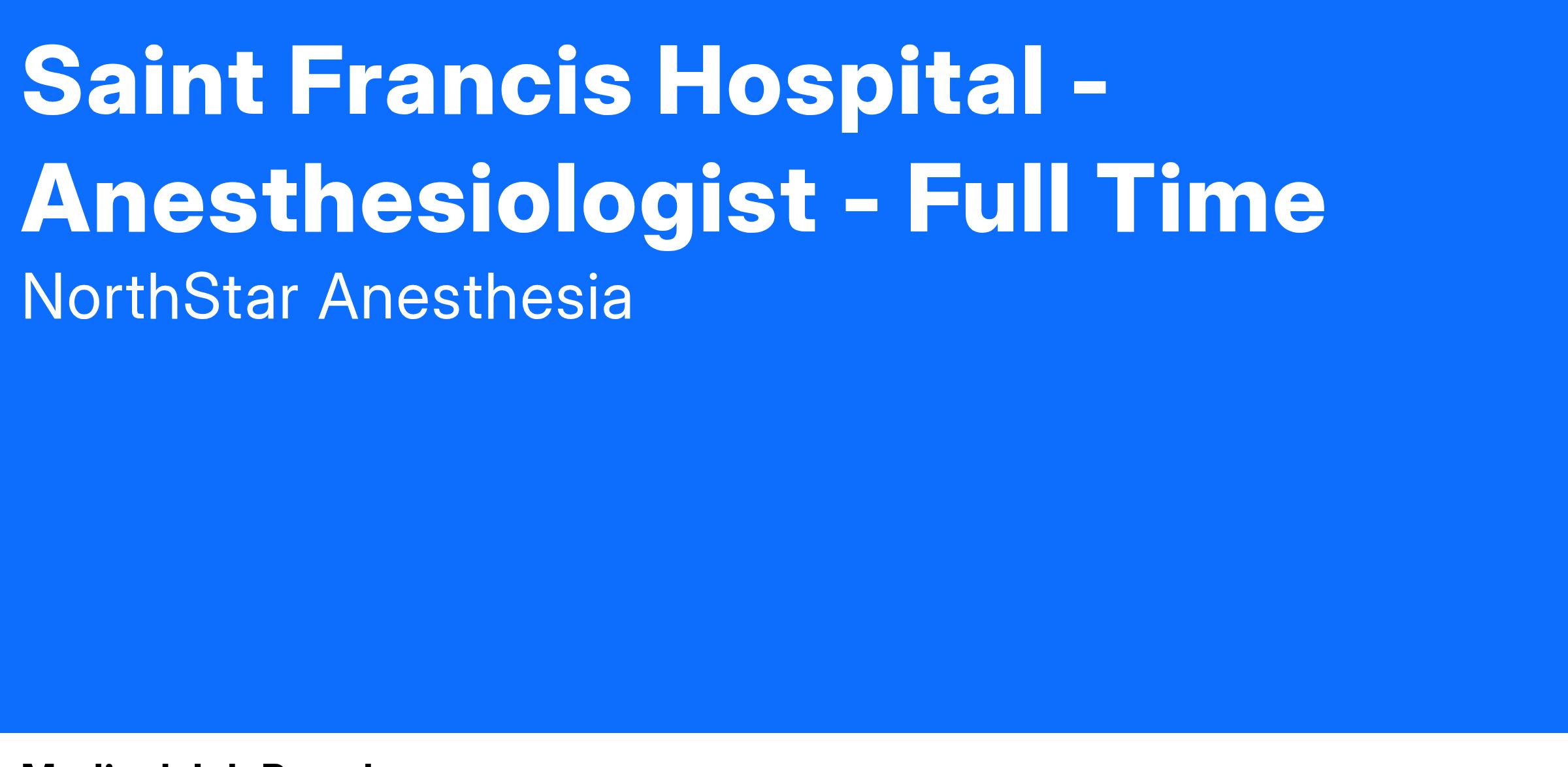 NorthStar Anesthesia is seeking a full-time anesthesiologist to join our team at Saint Francis Hospital in Wilmington, DE. You’ll work alongside a collaborative 4 MD team, covering a wide range of cases, including general surgery, vascular, ENT, OBGYN, neurology, orthopedics, and more. We handle 4,700 cases annually across 6-7 POS.
