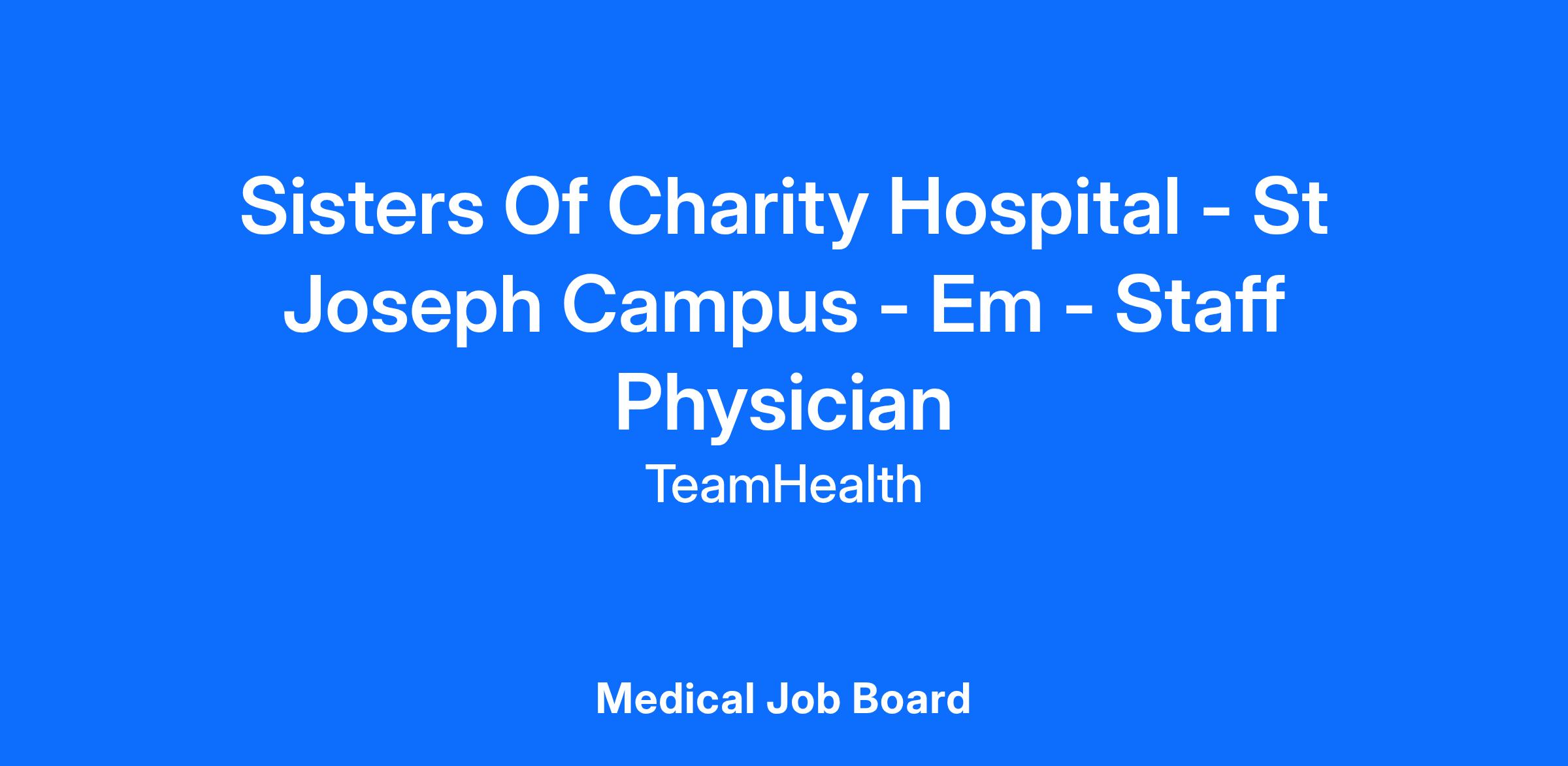 Job DescriptionGrow your emergency medicine (EM) career in Western New York! Located in Cheektowaga, Sisters of Charity St. Joseph Campus is a 125-bed hospital with an 18-bed emergency department. We treat approximately 30,000 patients per year in the ED and offer 24 hours of physician coverage and APC coverage daily.