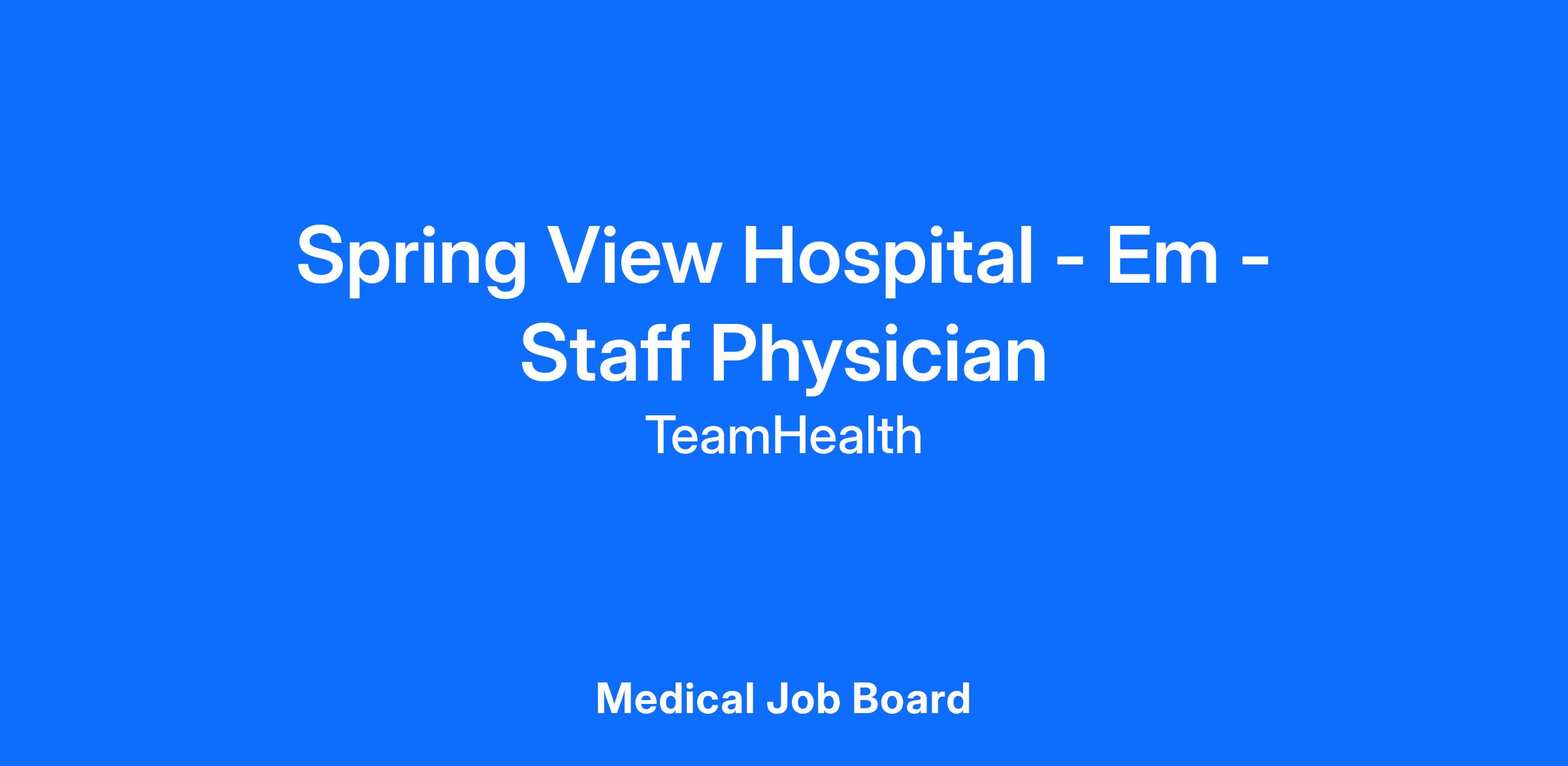 Job DescriptionTeamHealth has an excellent full-time opportunity for a physician to join our team at Spring View Hospital in Lebanon, Kentucky. Spring View Hospital is a 75-bed facility with 11 emergency department beds. No boards are required for physicians with emergency medicine experience.