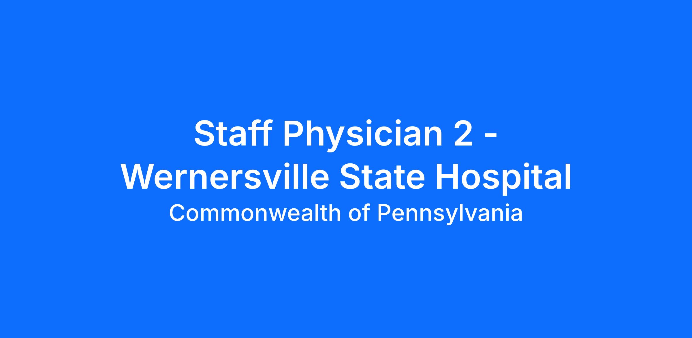 Bring your medical experience and training to the Department of Human Services and become an integral part of our team! Wernersville State Hospital is seeking dedicated Staff Physician 2s to provide leadership in planning, directing, and implementing medical services at our facility. If you are a hard-working, passionate, and caring individual who values playing a vital role in quality medical care, apply today!