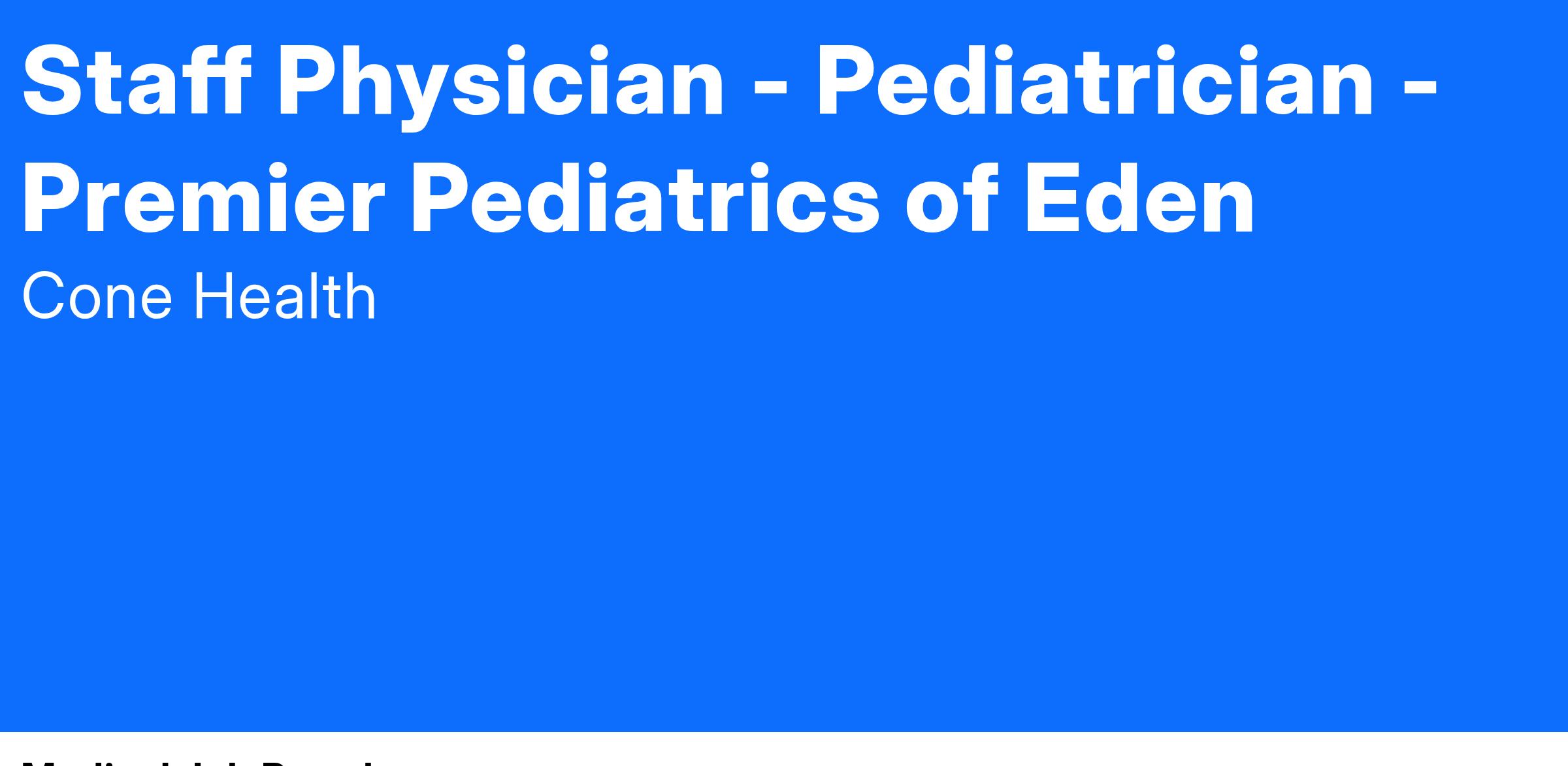Cone Health – Premier Pediatrics of Eden, NC, is in search of a patient-centered Pediatrician to join our collaborative, quality-driven team. Must have the ability and desire to thrive in a team-oriented environment and a personality to provide care to a diverse patient population. Our patients receive care close to home while benefiting from a knowledgeable Team with attention to value of care. From sick visits to regular checkups, the staff at Premier Pediatrics of Eden www.conehealth.com/locations/profile/premier-pediatrics-of-eden is committed to providing exceptional care to the children of northern Rockingham County.
