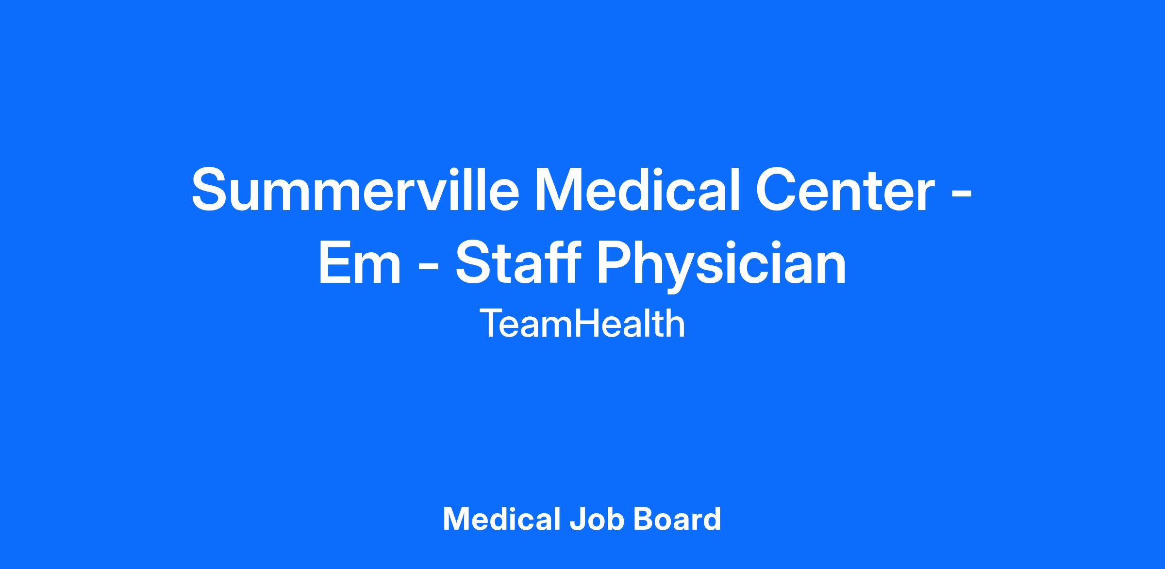 Job DescriptionAre you looking for a great career opportunity in one of the oldest cities in the United States, which is filled with history and beauty? Enhance your emergency medicine (EM) career with TeamHealth. Summerville Medical Center, part of the Trident Health System in Charleston, South Carolina, seeks an ABEM physician to join their seasoned emergency department (ED) team and support two new FSEDs opening in 2026. Join the excitement!