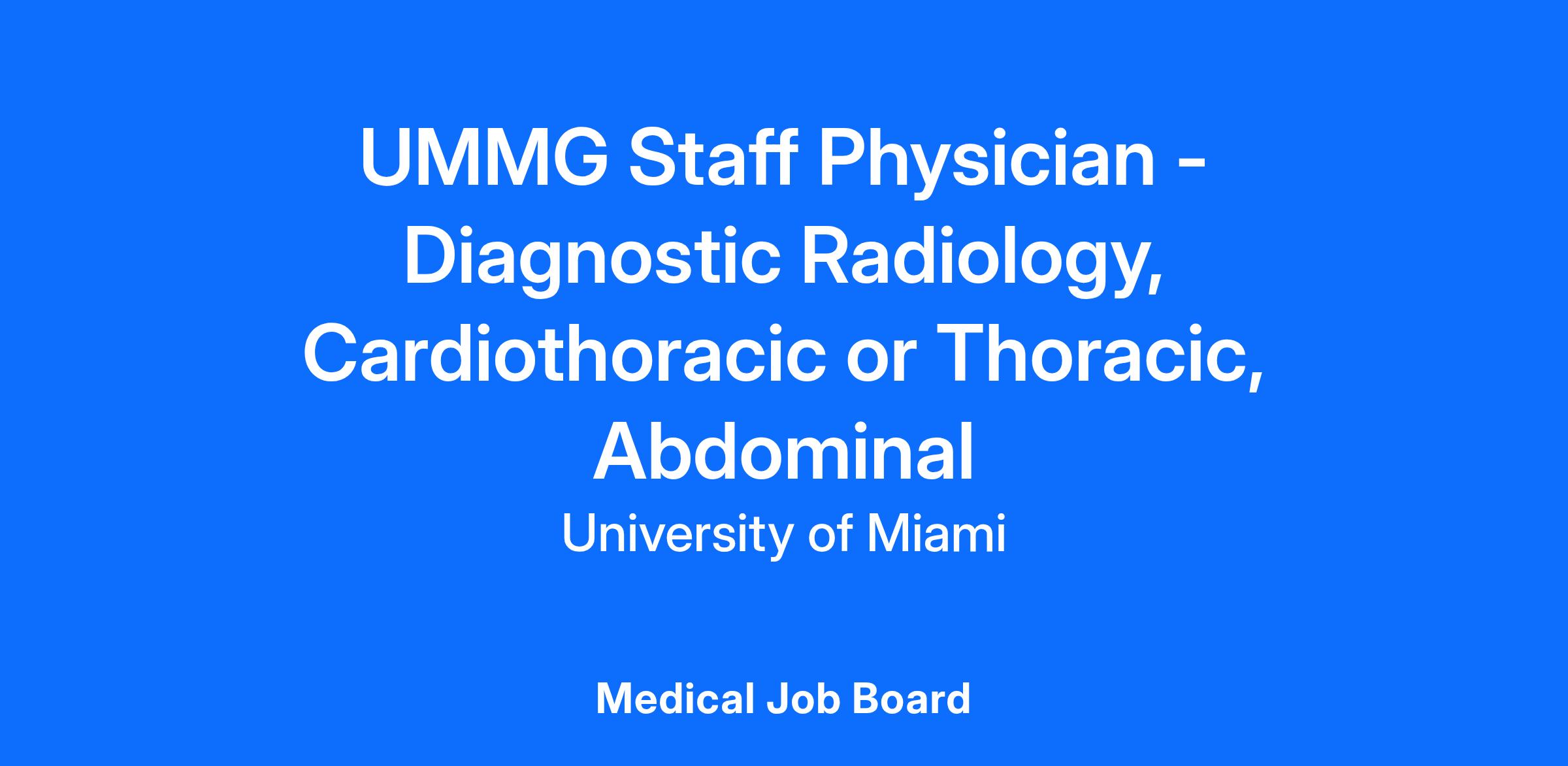 The Cardiothoracic and Abdominal Divisions in the Department of Radiology at the Leonard Miller University of Miami (UM) School of Medicine (UMSOM), invite applications for a full-time Staff Physician, community radiologist Our Health System is the largest academic center in South Florida, with a rapidly expanding footprint, and The applicant would join 13 Abdominal and 7 Cardiothoracic radiologists across multiple facilities, including Jackson Memorial (a primary, and tertiary care County hospital) and UM Hospitals and Clinics, but their primary sites of coverage would be in one of our 5 state of the art ambulatory care facilities in northern Miami-Dade County and Broward County.Β Our satellite facilities are centrally located in some of the most desirable suburban residential communities in South Florida.Β