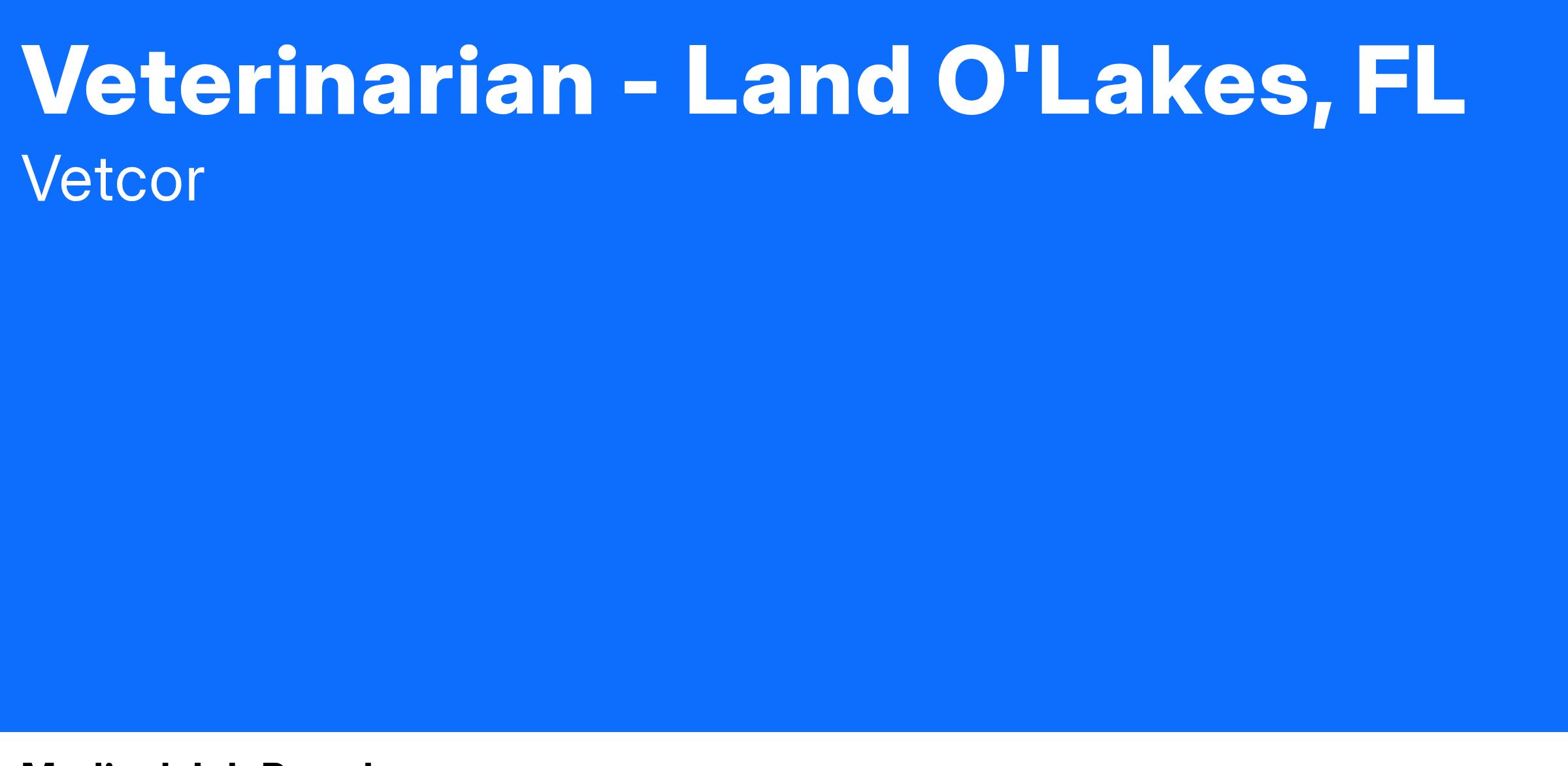 Land O'Lakes Animal Hospital in Land O' Lakes, FL is looking to add a Full -Time Veterinarian to their team! This hospital serves the Tampa Bay area and offers an array of services. This is a great opportunity for veterinarians looking advance their skillset and be part of a community. This is a great opportunity for new graduates and experienced veterinarians.