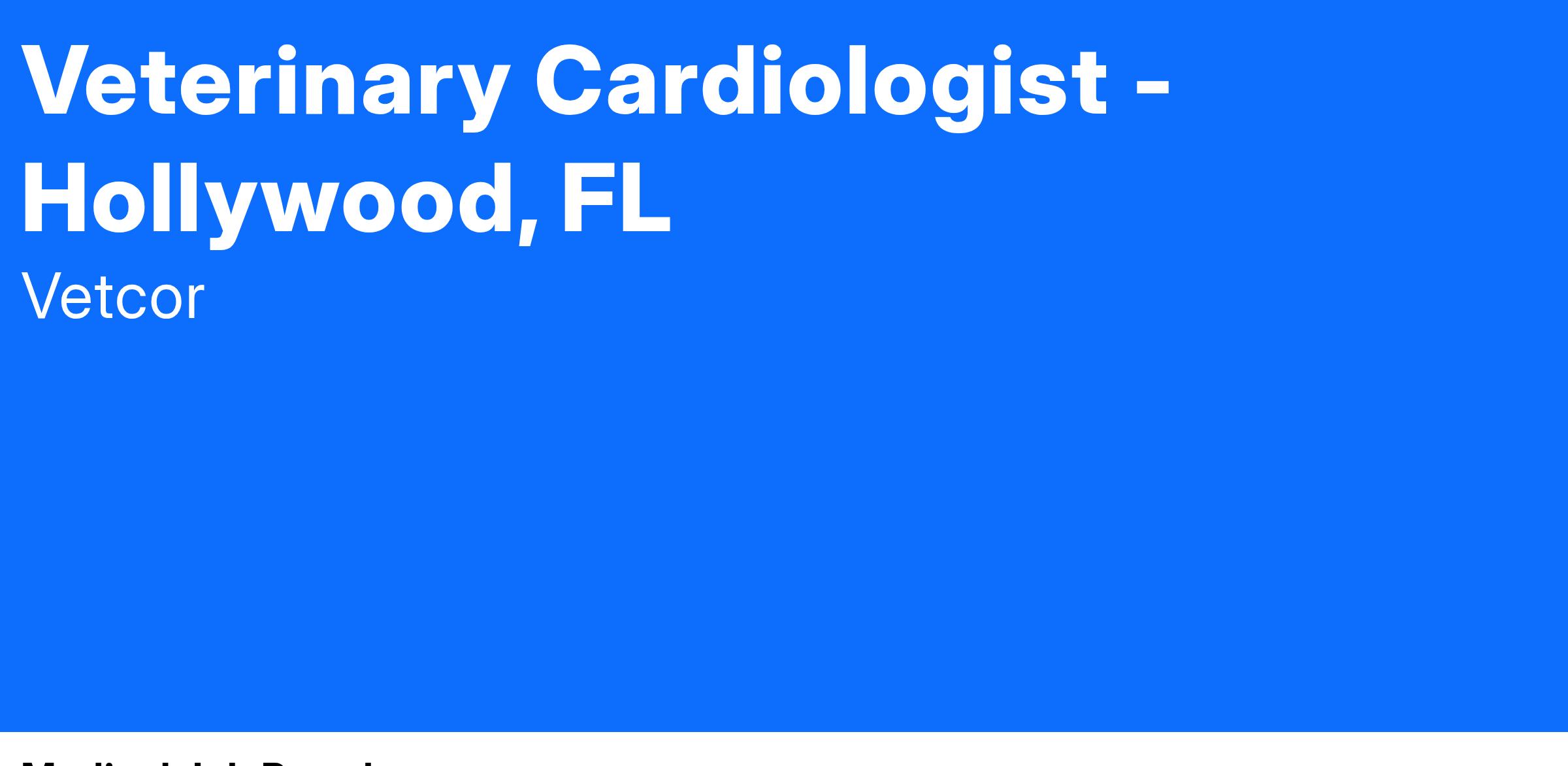 Broward Veterinary Specialists (BVS) in Hollywood, Florida is looking to add a Small Animal Cardiologist to our growing practice in Hollywood / Fort Lauderdale, Florida.