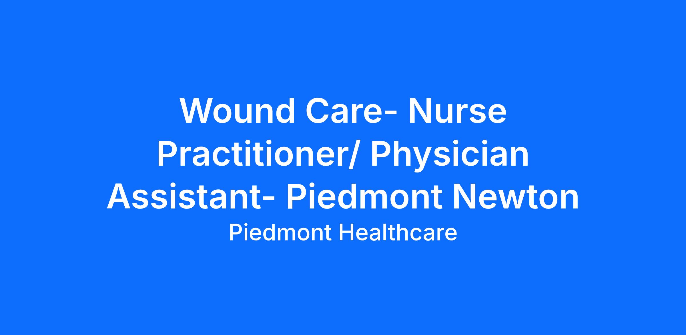 Piedmont is recruiting for an APP to join our wound care team at Piedmont Newton Hospital. This is a full-time Monday through Friday position with no call responsibilities. You will work alongside two physicians providing care to a variety of wound care and hyperbaric oxygen patients within the inpatient and outpatient setting.